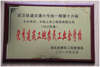 近日,從湖北省建筑工程管理局傳來喜訊,上海工程局市政公司武漢地鐵6號線16標項目部農民工業校榮獲2015年度湖北省“優秀建筑工地農民工業余學?!狈Q號。